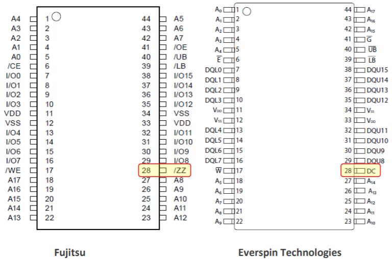 MRAM,組織為256kx16,由標稱3.3V電源供電,并與FRAM兼容。兩款產品均使用標準SRAM并行地址(A0-16)、字節寬雙向數據引腳(DQ0-7)和控制信號(/E、/W、/G)。每個都可以由一個公共定時接口支持,并將用作隨機存取讀/寫存儲器,在斷電時無需外部電池即可保留數據。Everspin不支持/ZZ睡眠功能。/ZZ可能需要上拉。