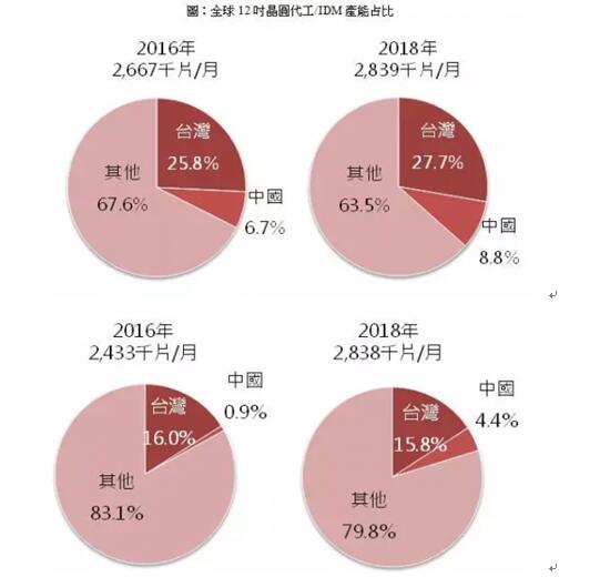 因此2018年中國企業(yè)規(guī)劃的新增產(chǎn)能目標(biāo)將可能難以實(shí)現(xiàn),預(yù)期下修到7.2萬片,其中中國廠商的先進(jìn)制程(28nm含以下)產(chǎn)能約1.2萬片,占新增產(chǎn)能近17%,預(yù)計(jì)2018年中國自主非存儲(chǔ)器產(chǎn)能將占全球非存儲(chǔ)器產(chǎn)能比重約6.7%。
