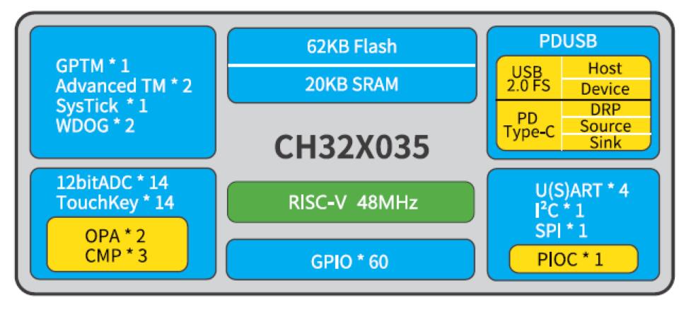 CH32X035系列是基于青稞V4C內(nèi)核設(shè)計的工業(yè)級微控制器。內(nèi)置USB和PD PHY,支持USB Host主機(jī)和USBDevice設(shè)備功能、PDUSB及Type-C快充功能,內(nèi)置可編程協(xié)議I/O控制器,提供OPA運(yùn)放、CMP電壓比較器、USART串口、/2C、SPI、定時器、12位ADC、Touchkey等豐富外設(shè)資源。