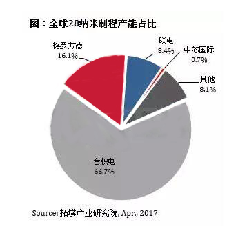 根據拓璞產業研究院資料顯示,在此之前中國大陸本土純晶圓代工廠商只有中芯國際量產了28納米制程晶圓,但其28納米晶圓產能全球占比不足1%,與方德(16.1%)、臺積電(66.7%)、格羅聯電(8.4%)等相比仍有較大差距。