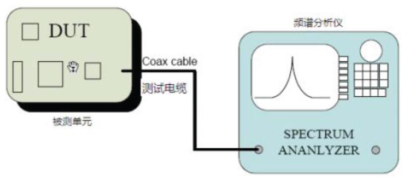 射頻發(fā)射信號(hào)通過產(chǎn)品的天線耦合到頻譜分析儀。測(cè)試裝置連接如下: