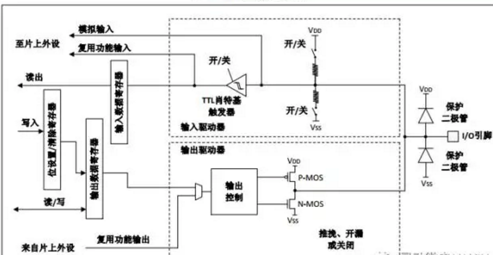 模擬輸入是指模擬信號(hào)的輸入。配置模擬輸入時(shí),所有的上拉、下拉電阻和施密特觸發(fā)器,均處于禁止?fàn)顟B(tài),因此“輸入數(shù)據(jù)寄存器”將不能反映端口上的電平狀態(tài),也就是說模擬輸入配置下,CPU不能在“輸入數(shù)據(jù)寄存器”上讀到有效的數(shù)據(jù)。