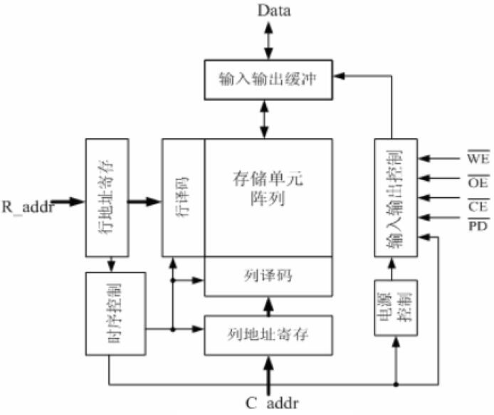 圖2.1 給出了SRAM的一般結構[1],主要包括存儲陣列、譯碼器、時序控制、輸入輸出緩沖、輸入輸出控制等。存儲陣列由存儲單元構成,用于保存數(shù)據(jù),存儲陣列的布局對整個存儲器的面積、功耗、可靠性等有著非常重要的影響;由于存儲陣列是按行、列分開組織的,因此,譯碼器也分為行譯碼器和列譯碼器,并且地址譯碼之前,需要對地址進行緩存;輸入輸出緩沖是存儲陣列與外部數(shù)據(jù)交換的接口,用于放大存儲單元讀出的信號,以及將輸入信號寫入到存儲陣列之中;輸入輸出控制模塊根據(jù)控制信號的時序要求,控制存儲器的讀出、寫入等操作;電源控制是一個可選的電路單元,主要是為了低功耗的要求,當整個存儲器不需要進行讀寫操作時,通過電源控制可以控制內(nèi)部無效的翻轉操作,從而節(jié)省功耗。完整的存儲結構中可能還包括測試電路模塊,例如內(nèi)部監(jiān)測電路、BIST電路等等。