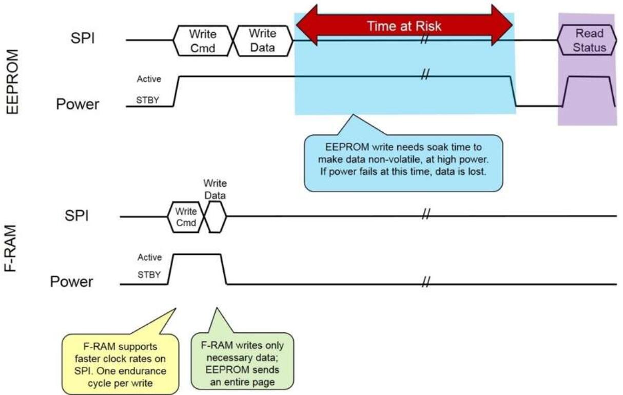 圖2:FRAM的快速寫入速度可保護(hù)使用EEPROM設(shè)備時可能丟失的關(guān)鍵數(shù)據(jù)。(來源:賽普拉斯半導(dǎo)體)