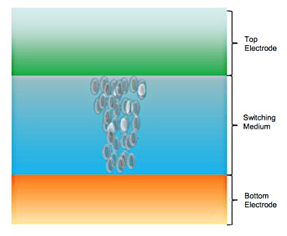 OxRAM 和 CBRAM 都是二端器件——由一個頂部電極和一個底部電極組成。在兩個電極之間是開關介質。