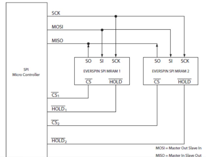 單個(gè)或多個(gè)器件可以連接到SPI總線,如下所示。引腳SCK,SO和SI是常見(jiàn)的設(shè)備。每個(gè)器件都需要分別驅(qū)動(dòng)CS和HOLD引腳。